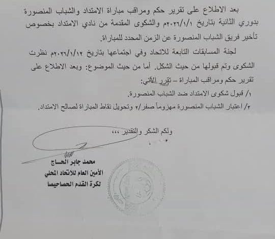 وبعد الاطلاع على تقرير حكم ومراقب المباراة والشكوى الرسمية المقدمة في الأول من يناير 2026 عقدت لجنة المسابقات اجتماعها بتاريخ الثاني عشر من يناير 2026 حيث درست الشكوى من الجانبين وقررت قبولها من حيث الشكل والموضوع..