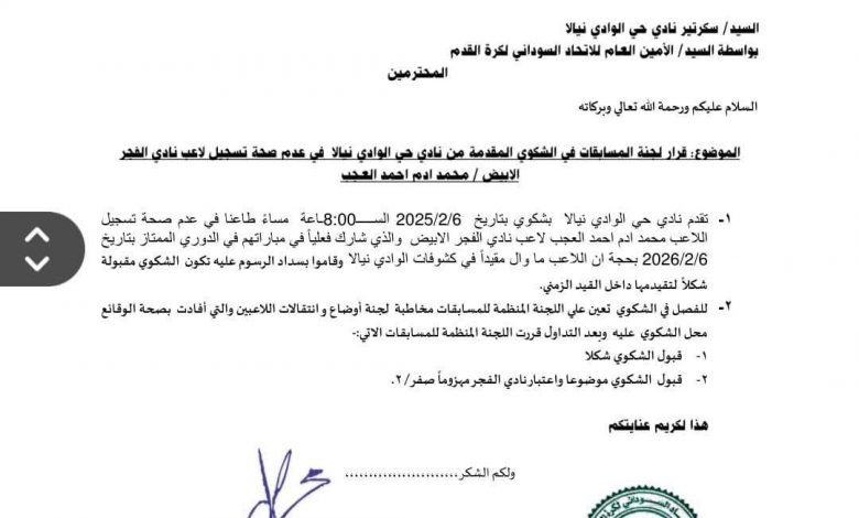 بقبول شكوى حي الوادي نيالا ضد الفجر الأبيض، أدى إلى تغيير كبير في مجموعة الغرب من ناحية موقف الصعود للنخبة والهبوط من الممتاز..