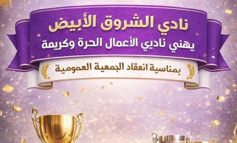يتقدّم مجلس إدارة نادي الشروق الأبيض بأصدق آيات التهاني وأطيب التبريكات إلى أسرتي نادي الأعمال الحرة الأبيض ونادي كريمة الأبيض، وذلك بمناسبة انعقاد جمعيتيهما العموميتين في أجواء سادها الوعي والمسؤولية، وفي مناخ ديمقراطي راقٍ أكد على روح الشفافية والتوافق والعمل المؤسسي.