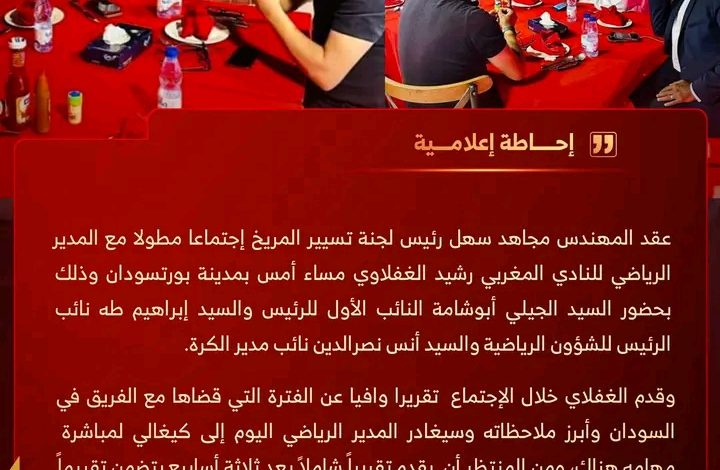عقد المهندس مجاهد سهل رئيس لجنة تسيير نادي المريخ، اجتماعا مطولاً مع المدير الرياضي لنادي المريخ المغربي رشيد الغفلاوي بمدينة بورتسودان..