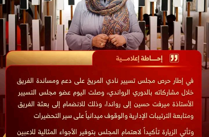 في إطار حرص مجلس تسيير نادي المريخ على دعم ومساندة الفريق خلال مشاركاته في الدوري الرواندي، وصلت اليوم عضو المجلس ميرفت حسين إلى رواندا، وذلك للانضمام ومتابعة الترتيبات الإدارية والوقوف ميدانيا على سير التحضيرات قبل مباراة القمة..