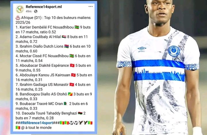 تم تصنيف محترف الهلال ” أداما كوليبالي “، هو ثاني أفضل هدّاف مالي في الدوريات الأفريقية خلال الموسم الجاري برصيد 8 أهداف ..