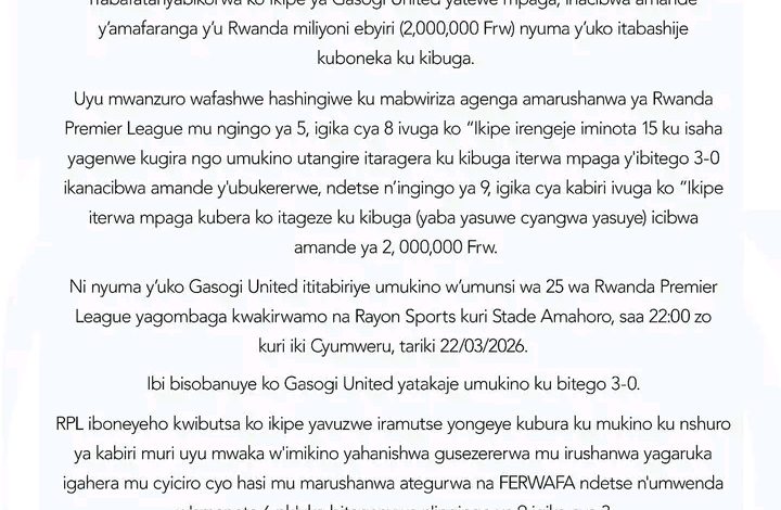 يأتي هذا بعد أن لم يشارك فريق غاسوغي يونايتد في مباراة الجولة الخامسة والعشرين من الدوري الرواندي الممتاز، والتي كان من المقرر أن يستضيفها فريق رايون سبورتس في ملعب أماهورو، في تمام الساعة 22:00 من يوم الأحد الموافق 22/03/2026.