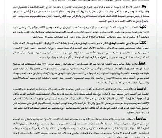رابعاً: ما ورد حالياً وسابقاً بربط الاعتذار عن مواجهة الأرجنتين في فترة التوقف الدولي لشهر مارس 2026م بهذه الاستحقاقات غير صحيح البتة، فهؤلاء اللاعبون كما أوضحنا سابقاً تسلموا أكثر من 80% من استحقاقاتهم وليس هنالك ما يمنعهم من أداء المباراة، كما أن اللاعبين طيلة مسيرتهم مع المنتخب لم يأتوا بهذا السلوك ولم يتمرّدوا على المنتخب، بل كانوا متفهمين لظروف الاتحاد ومتعاونين لأبعد الحدود، وهذا كذبٌ صريحَ، أضف لذلك أن رغبة اللاعبين في مواجهة رفاق ميسي تمنعهم من التمرد ورفض اللعب، والحقيقة التي يرفضها أصحاب الأجندة والغرض، إننا رفضنا مواجهة الأرجنتين لأسباب فنية.