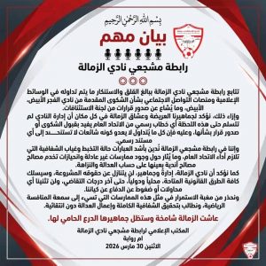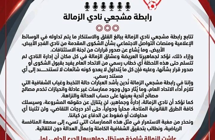 تتابع رابطة مشجعي نادي الزمالة ببالغ القلق والاستنكار ما يتم تداوله في الوسائط الإعلامية ومنصات التواصل الاجتماعي بشأن الشكوى المقدمة من نادي الفجر الأبيض، وما يُشاع عن صدور قرارات من لجنة الاستئنافات.