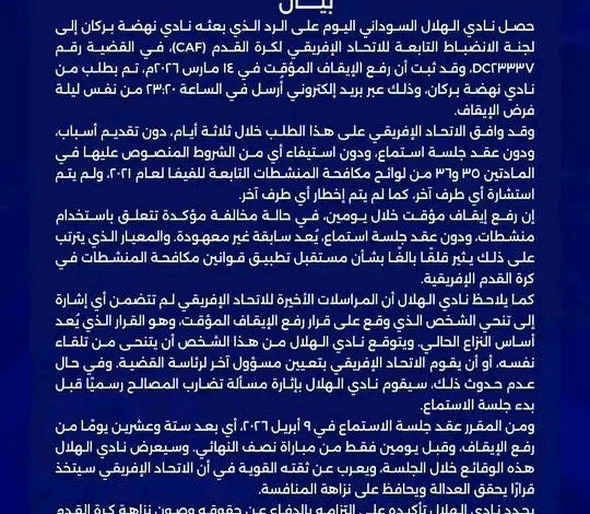 أصيبت جماهير الهلال بالاحباط عقب البيان الأخير الصادر من إدارة النادي ، أعلن فيه عن صحة إجراءات نهضة بركان المغربي تجاه رفع الايقاف عن لاعبه الموساوي ، بقية تفاصيل البيان المحبط هنا 👇
