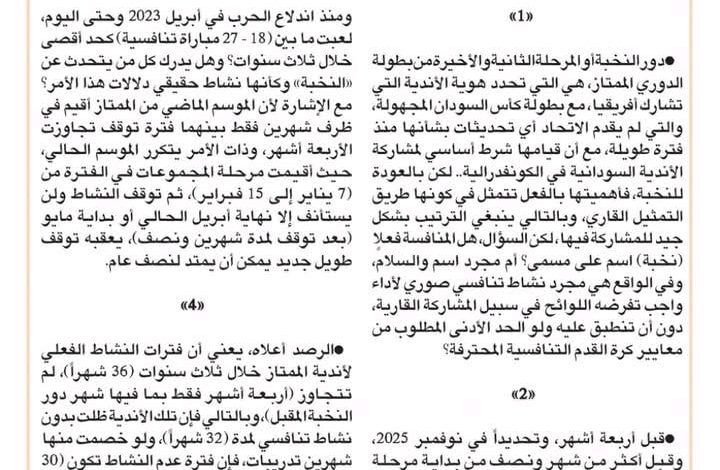 •قبل أربعة أشهر، وتحديداً في نوفمبر 2025، وقبل أكثر من شهر ونصف من بداية مرحلة مجموعات الدوري الممتاز، كتبت مقالاً بعنوان “النشاط الصوري ونجوم الدافوري”، تطرقت فيه للآثار المدمرة التي أصابت الأندية السودانية ولاعب كرة القدم المحلي بعد الحرب، جراء توقف النشاط لفترات طويلة جداً، ومن ثم عودته بشكل (صوري) فقط، لا تتوفر فيه ولو 1% من مواصفات النشاط التنافسي الحقيقي، الذي يمكن النقاش حوله وفقاً للمعايير المعروفة لكرة القدم.
