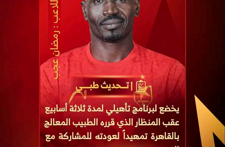 في تطورات جديدة كشفت اللجنة الطبية بنادي المريخ ان رمضان عجب سيخضع لبرنامج تأهيل لثلاث اسابيع ..