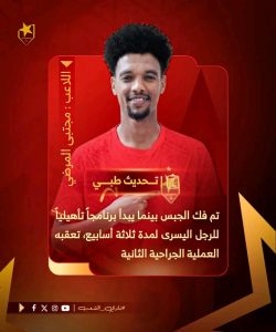 تم فك الجبص من القدم اليسرى للاعب مجتبى المرضي، وسينخرط في برنامج تأهيل قبل إجراء العملية الجراحية الثانية..
