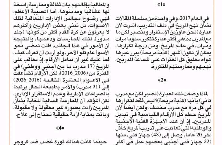 في العام 2017، وفي واحدة من سلسلة المقالات بشأن نهج المريخ في ملف التدريب، أشرت لأن عبارة (نحن عاوزين الإستقرار وبنصبر لكن ما مع المدرب ده) هي أكثر عبارة تتكرر سنويا مرات ومرات، في عالم المريخ، ومن درجة تكرارها، يمكن أن تكون أشهر (كذبة مريحة) يبرر عبرها هواة تعليق كل العثرات على شماعة المدربين، نهجهم وممارستهم المتكررة.