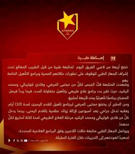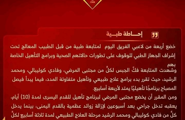 خضع لفك الجبس، وسيبدأ برنامجاً تأهيلياً للقدم اليسرى لمدة 10 أيام، يليه تدخل جراحي بعد أسبوعين لإزالة زوائد عظمية في القدم اليمنى.