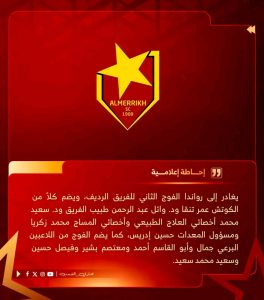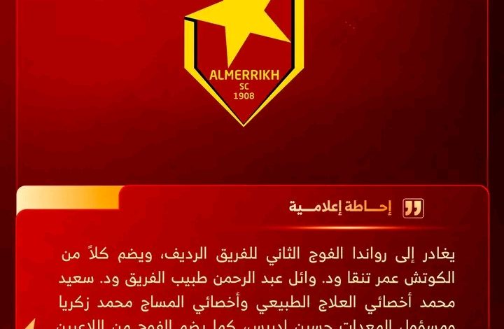 يغادر اليوم الأربعاء الفوج الثاني لرديف فريق المريخ إلى رواندا بقيادة الكوتش عمر تنقا وطبيب الفريق وأخصائي العلاج الطبيعي وأخصائي المساج ومسؤول المعدات وخمسة من لاعبي الفريق..