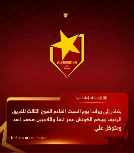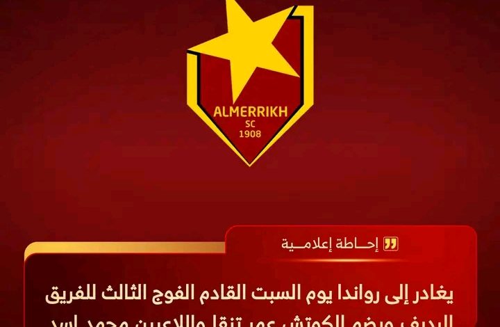 يغادر إلى رواندا السبت القادم الفوج الثالث للفريق الرديف بنادي المريخ، ويضم الكوتش عمر تنقا واللاعبين محمد اسد ومتوكل علي..
