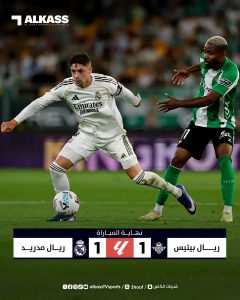 ريال بيتيس يتعادل 1-1 مع ريال مدريد على ملعب دي لا كارتوجا ضمن لقاءات الجولة الـ 33 من بطولة الدوري الإسباني..