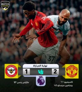 مانشستر يونايتد يوصل الانتصارات بالبريميرليغ بثنائية بمرمى برينتفورد مساء اليوم الإثنين ويقترب من التأهل لدوري أبطال أوروبا.