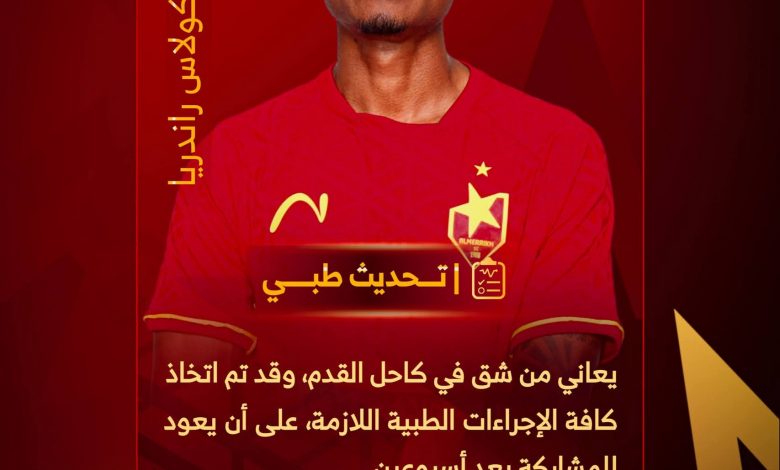 يعاني المدغشقري نيكولاس من شق في كاحل القدم، وقد تم اتخاذ كافة الإجراءات الطبية اللازمة، على أن يعود بعد اسبوعين..