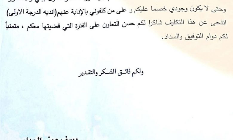 وارجع (زوف) أسباب استقالته لظروف خاصة تحول بينه وبين الاستمرار في عمله، وحتى لا يكون خصما على الاتحاد ولكل من وضع ثقته في شخصه من (كتلة الدرجة الأولى)..