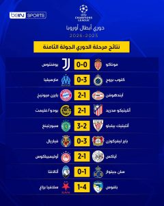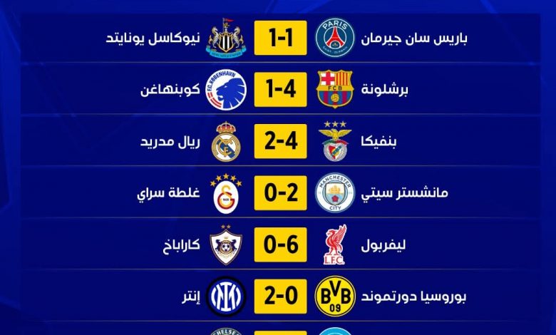 نتائج المباريات التي جرت الأربعاء من مرحلة الدوري ضمن بطولة دوري أبطال أوروبا – الجولة الثامنة والأخيرة..