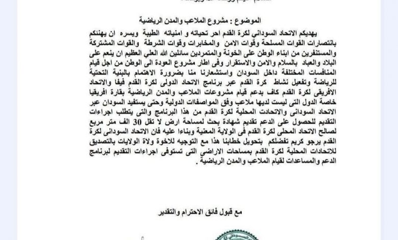 طالب الاتحاد العام لكرة القدم السوداني الاتحادات المحلية عبر وزير الحكم المحلي، بمخاطبة حكومات الولايات للتصديق على تخصيص مساحات لا تقل عن 30 ألف متر مربع للاتحادات المحلية، وذلك لتشييد استادات رياضية وفق المواصفات الدولية.