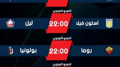 ليون ضد سيلتا فيجو.. الساعة 19:45 أستون فيلا ضد ليل.. الساعة 22:00 روما ضد بولونيا.. الساعة…