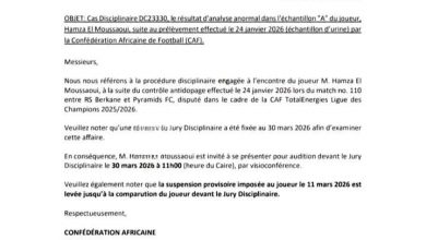 الموضوع: قضية تأديبية DC23330، نتيجة تحليل غير طبيعية في عينة “أ” للاعب حمزة الموساوي، بعد التحليل…