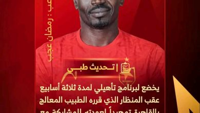 في تطورات جديدة كشفت اللجنة الطبية بنادي المريخ ان رمضان عجب سيخضع لبرنامج تأهيل لثلاث اسابيع ..…